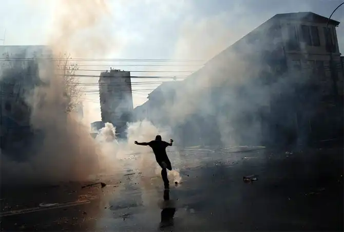 Демонстрант пинает газовую гранату во время антиправительственных выступлений в Вальпараисо, Чили.