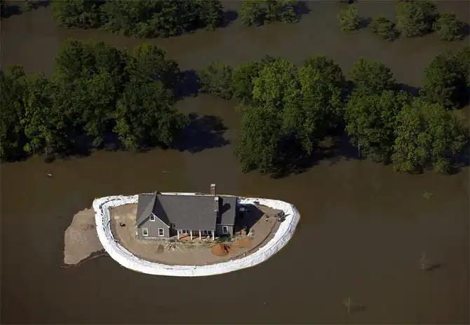 Дом, защищенный от вышедшей из берегов реки Миссисипи недалеко от города Язу-Сити.