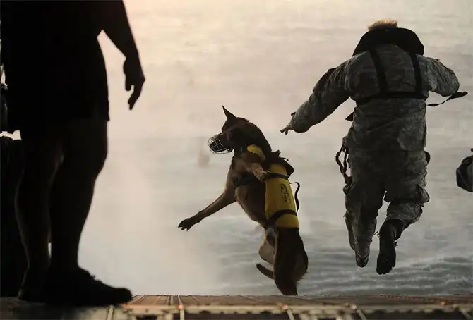 Американский солдат и его собака прыгают из вертолета в воды Мексиканского залива, во время учений.