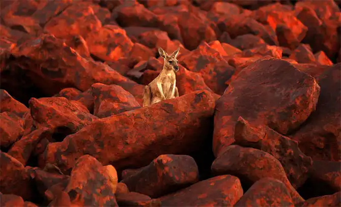 Кенгуру на валунах железной руды недалеко от порта Дампир на западе Австралии.