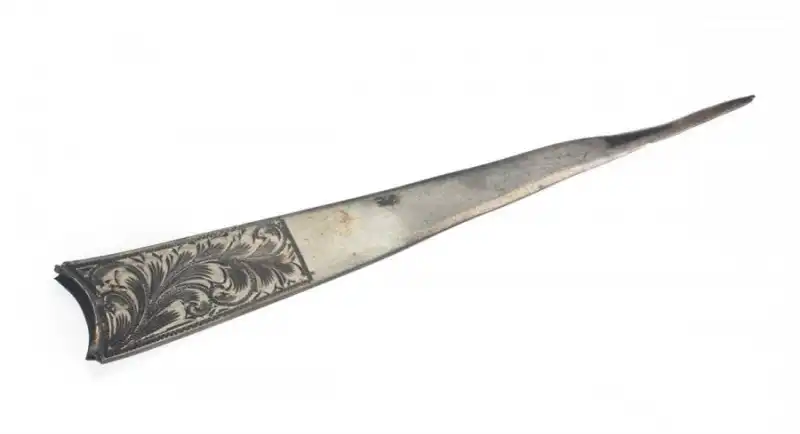 3. Серебрянный нож без ручки, служивший для разрезания бумаг. На ноже выведены слова: «ЛИ-ПАУЛА/Я тебя люблю». 15-сантиметровый нож покрыт гравировкой и травлением.
