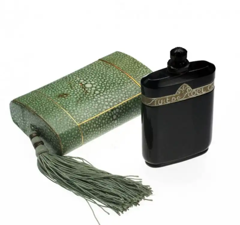 11. Еще один лот аукциона – флакон духов Монро с футляром к нему. Духи Nuit de Noel от Caron в старинном матовом черном стеклянном флаконе с декоративной этикеткой из золотой фольги и граненой пробкой. Оригинальный картонный футляр покрыт искусственной шагренью. С внутренней стороны крышки футляра можно рассмотреть слова: «Caron 10 rue de la Paix Paris France». Франк Розенберг, коллега Монро в кино, получил этот флакон от Мэрилин. Высота флакона: 11,7 см.