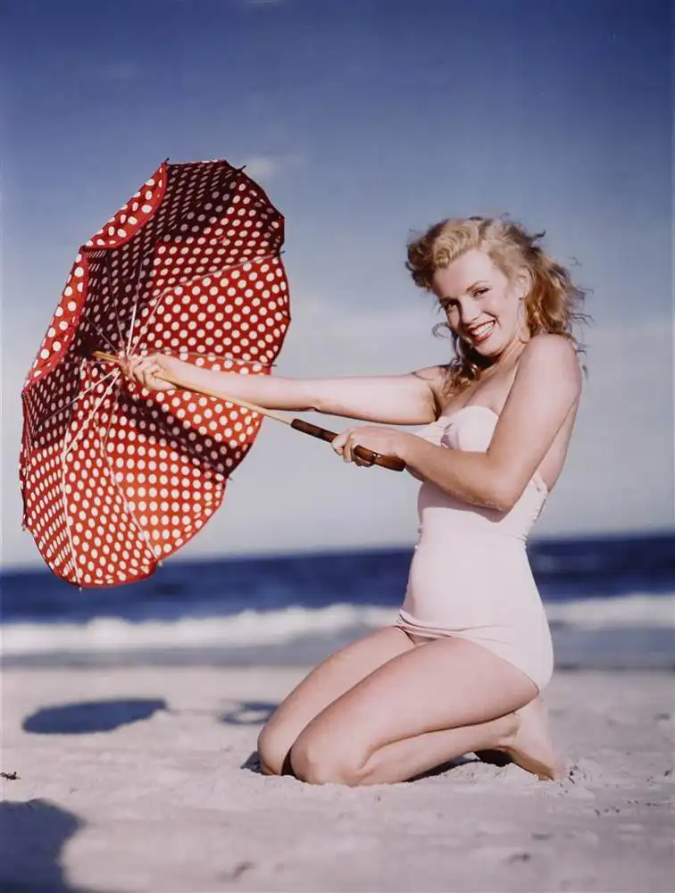 5. Плакат 1940-х годов в цвете, изображающий Мэрилин в красно-полосатом бикини в полный рост. Плакат оформлен в рамку. В нижних углах его по обе стороны можно рассмотреть надписи: «Мэрилин Монро» и «Отпечатано в США». Размеры плаката: 183,3 см на 78,7 см. Цена: от 1000 до 1200 долларов.