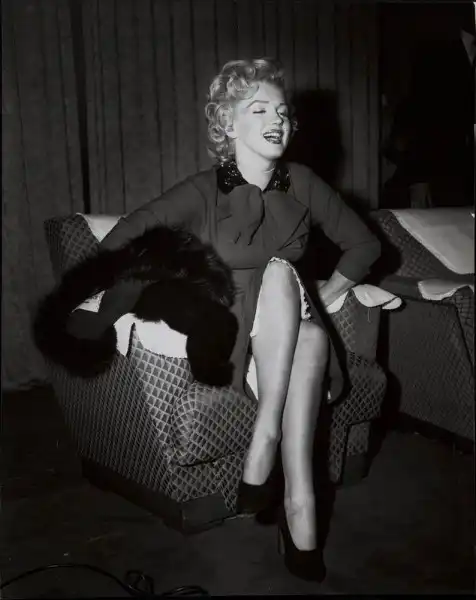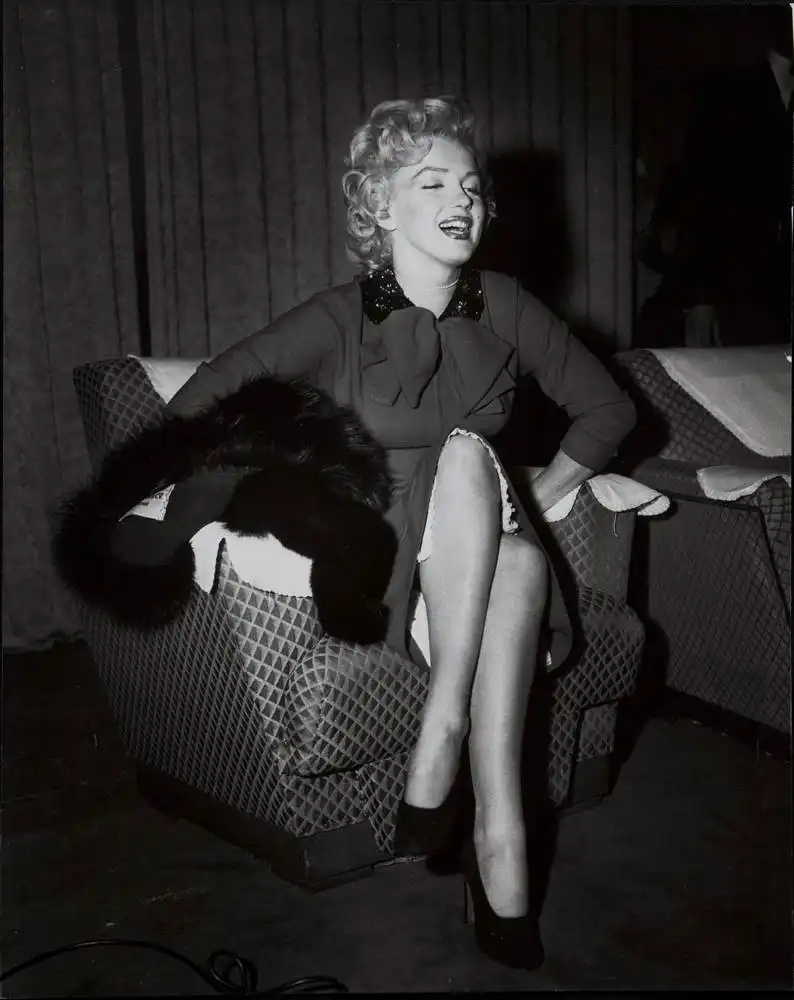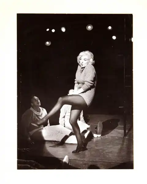 20. На этой фотографии Мэрилин танцует во время съемки фильма «Займемся любовью» (кинокомпания 20th Century Fox, 1960 год). Согласно контракту 1955-56 годов со студией, Монро должна была сняться еще в четырех фильмах в семилетний период. К концу 1960 года актриса снялась лишь в одном фильме – «Автобусная остановка», поэтому предложение сняться в фильме «Давай займемся любовью» было очень кстати для Мэрилин. Обратная сторона фото содержит надпись: «John Bryson, Box 616, Beverly Hills, California». Размеры снимка: 33,8 см на 25,4 см. Цена: от 200 до 400 долларов.