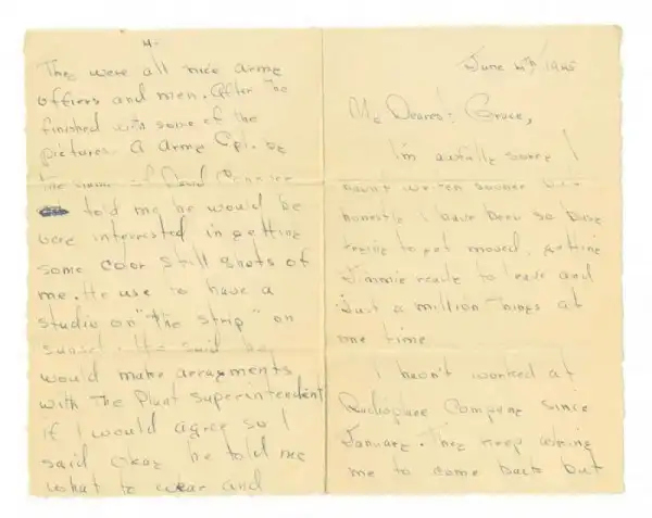 2. 8-страничное письмо, адресованное приемной матери Грейс Годдард и написанное от руки Нормы Джин Догерти, датировано 4 июнем 1945 года. В этом письме Норма рассказывает, что бросила работу на заводе Radioplane, и как во время фотосессии для фотографов Армии США познакомилась с Дэвидом Коновером, который был «ужасно красив, женат и предан своей работе, за это я его и любила». В письме также сказано, что Коновер поощрял ее стать моделью. Оригинальный конверт также является частью этого лота на аукционе. Размеры: 10,8 см на 17,8 см. Цена: от 30 до 50 тысяч долларов.