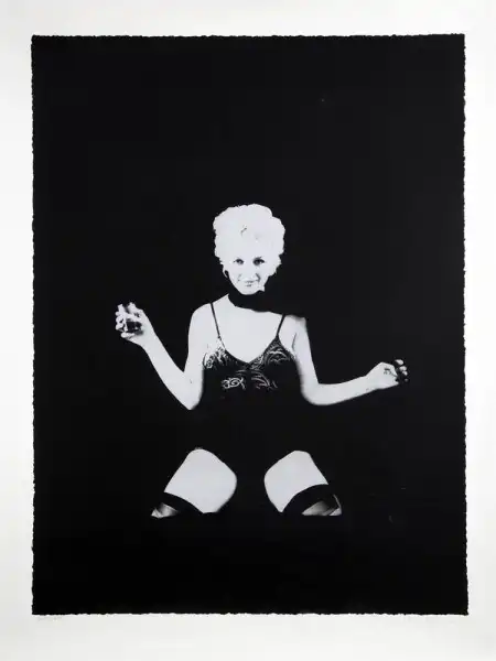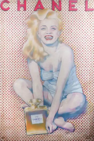 16. Фотография с использованием технологии шелкографии на холсте, изображающая Мэрилин с флаконом духов Chanel No. 5. Автор снимка Пьетро Псае позже передал его Анне Николь Смит. На холсте имеется пометка «A/P Proof» и «Not for public sale/Client design». Размеры: 135,2 см на 90,2 см. Цена: от 1000 до 2000 долларов.