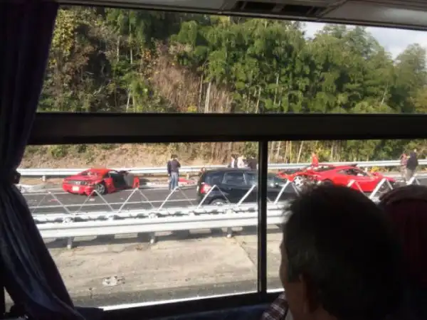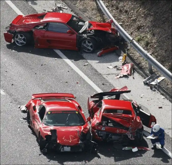 В Японии на скоростном шоссе произошла самая дорогая авария в стране. В ней пострадало 14 автомобилей, из них: две Ferrari 355s, две Ferrari 360, две Ferrari 430s (одна из которых была редким вариантом Scuderia), Ferrari 512, Lamborghini, три Mercedes-Benz и Toyota Prius.