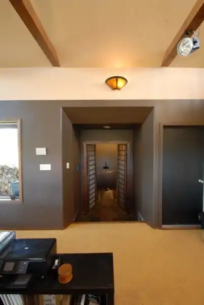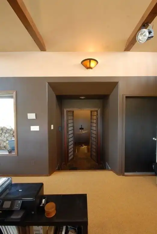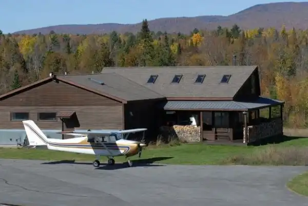 Необычный дом расположен в горах Адирондак на севере штата Нью-Йорк и внешне не отличается от других загородных коттеджей на озере Саранак. Он окружен лесом площадью около 8 гектаров, в котором есть взлетно-посадочная полоса для самолета.