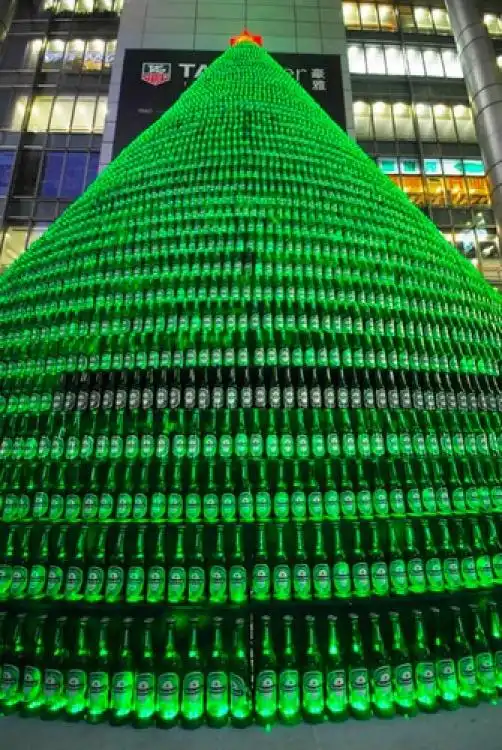 Как компания Jack Daniel's создала рождественскую елку из 140 бочек с этим напитком, так и Heineken выделила тысячу пивных бутылок на сооружение новогодней красавицы в Шанхае. И, что самое замечательное, елка эта – настоящего, зеленого цвета!