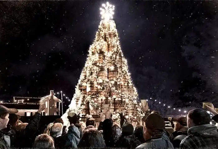 Небольшой американский городок Линчбург (штат Теннеси) известен всему миру как родина виски Jack Daniel's. И, конечно же, именно в этом населенном пункте была создана рождественская ель, сделанная из 140 бочек с упомянутым спиртным напитком внутри. Открытие столько необычного объекта было отпраздновано сотнями литрами Jack Daniel's.