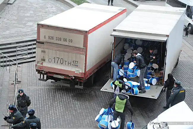 Недалеко от входа на митинг стояла машина с барабанами, большими флагами и маленькими флажками, а также громкоговорителями.