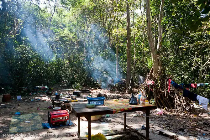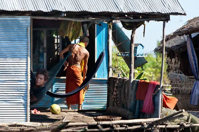 Живут в Камбодже, мягко скажем, не богато. Дома похожи на избушки на курьих ножках. Люди спят в гамаках под домами, а кухни вынесены на улицу под навес.