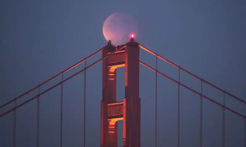 К тому же, это был последний шанс увидеть «невероятное» лунное затмение с красной луной и восходящим солнцем одновременно в небе. В отличие от солнечного, лунное затмение – довольно частое явление, происходящее, в среднем, каждые два года. А все потому, что луна на одну треть меньше Земли, поэтому легко помещается в тень нашей планеты. На фото: луна над мостом Золотые ворота. (AP)