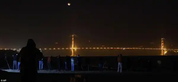 Люди фотографируют луну во время затмения над северной башней моста Золотые ворота в Сан-Франциско. (AP)
