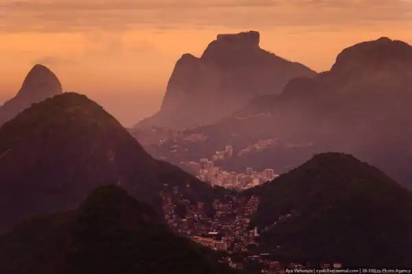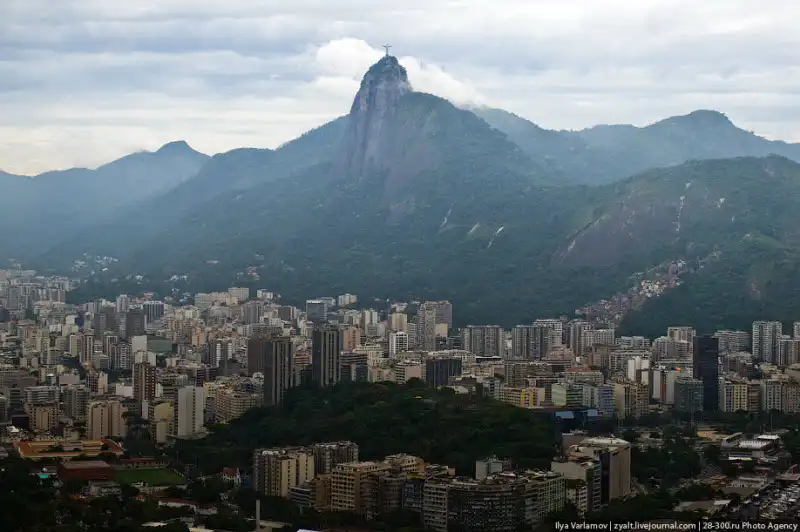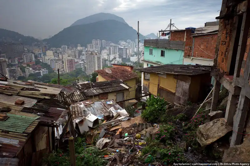 На склонах окрестных гор ютятся убогие жилища. Это беднейшие районы города — фавелы. В городе насчитывается несколько сотен фавел. По сути это мини-государства в государстве. Федеральные власти в дела фавел практически не вмешиваются. В большинстве фавел уровень жизни очень низкий, часто здесь нет элементарных удобств, школ, больниц и т. п. и, как следствие всего этого, крайне неблагоприятная криминогенная обстановка и ужасное санитарное состояние. Гулять по таким районам не рекомендуется, так как можно лишиться всего ценного и очень быстро. Но во многих фавелах местные жители за деньги проводят экскурсии. Мы прошли всю фавелу Санта-Марта от верха, с вершины холма, до низа и лишь только в одном квартале «охрана» посоветовала не фотографировать встречающихся нам людей...
