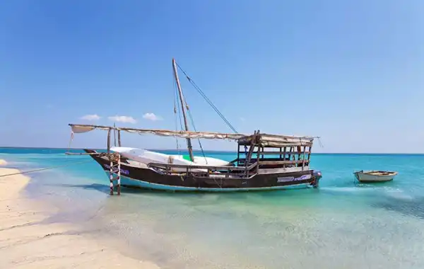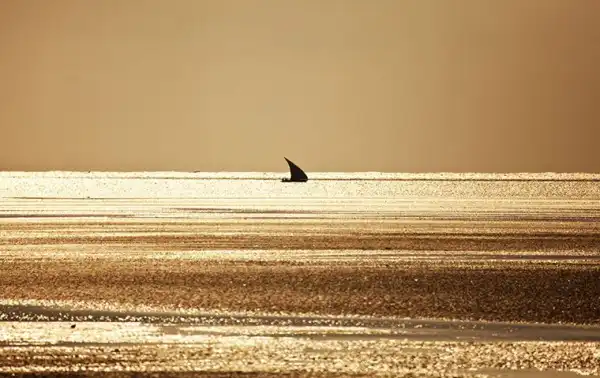 Доу с характерным треугольным парусом медленно плывет вдоль горизонта.