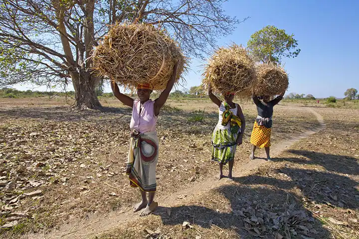 Местные жители возвращаются со скошенной травой, которая будет использована в качестве крыши.
