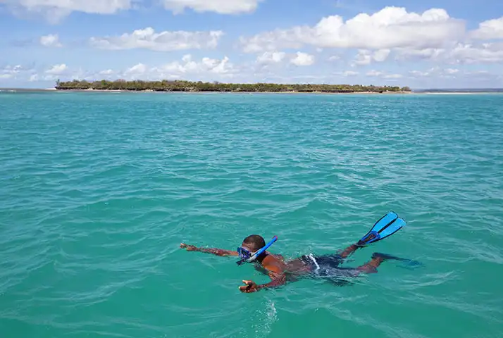 Мужчина с маской и трубкой плавает у берегов острова Могундула. Коралловые обнажения здесь являются домом для огромного разнообразия рыб.