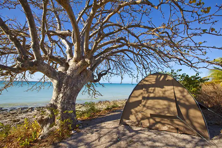 Палатка рядом с баобабом на Могундула. Когда-то остров был заселен людьми, страдающими слоновой болезнью, но сейчас он нашел активное применение в качестве роскошного места для проведения отпусков.