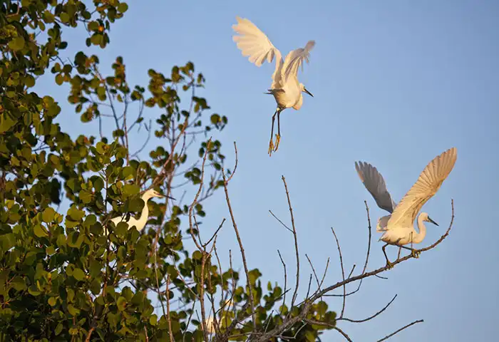 Белые цапли отлетают от веток. Наблюдение за птицами пользуется большой популярностью среди туристов на архипелаге.