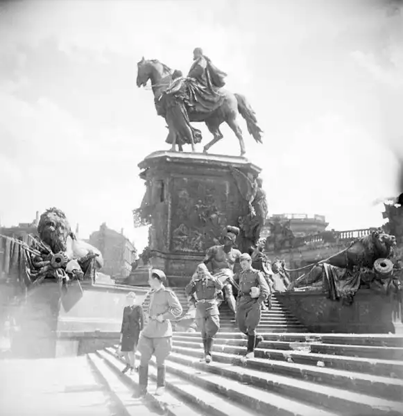 1. Группа русских солдат на ступенях Рейхсканцелярии.