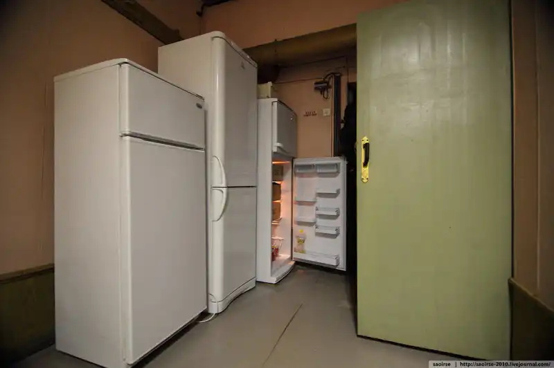 Столовая: есть плита, стеллажи с посудой и три холодильника для запасов.