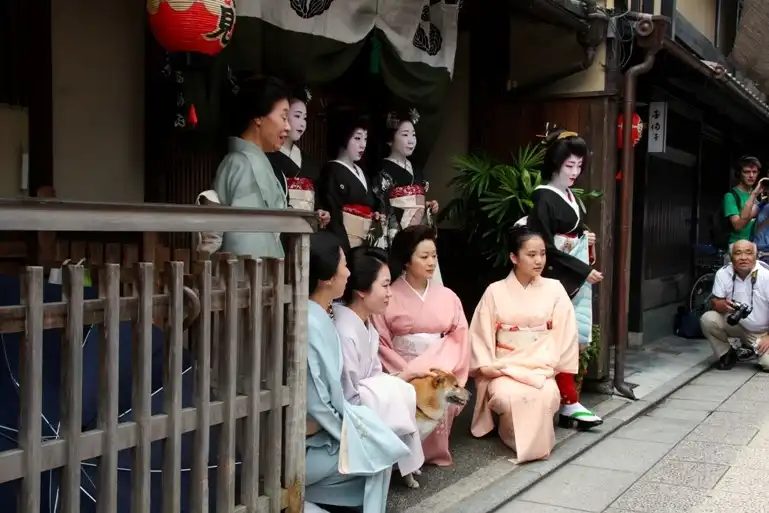 Все обитательницы одного дома гейш, окия, усаживаются для общего «семейного» фото. Даже с собачкой.