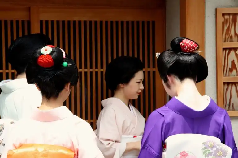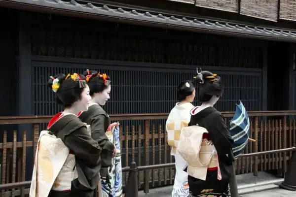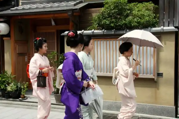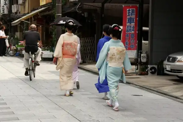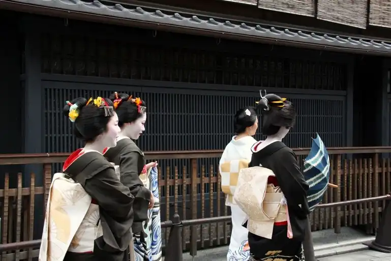 Справа в светлом кимоно — самая старшая гейко («гейко» — гейша на диалекте Киото). Рядом с ней другая гейко в формальном кимоно и официальном парике. За ними идут две майко.