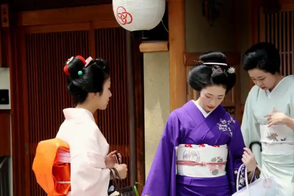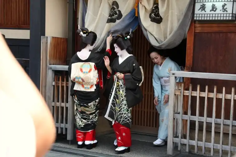 Окаасан и две сикоми. Сикоми можно стать с 15 лет. В наше время «записываться в гейши» можно добровольно, по собственному желанию. Молоденькие ученицы пока еще и кимоно толком носить не умеют и всего стесняются.