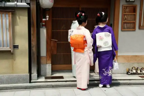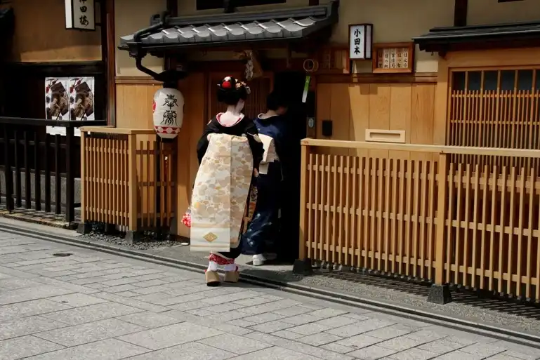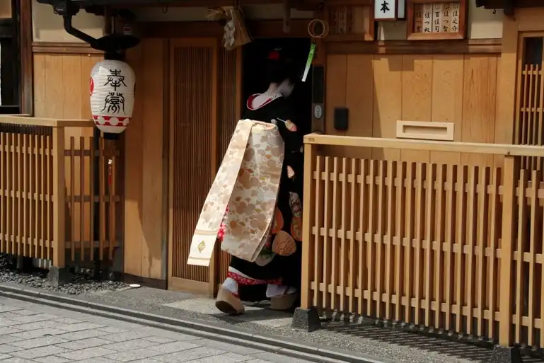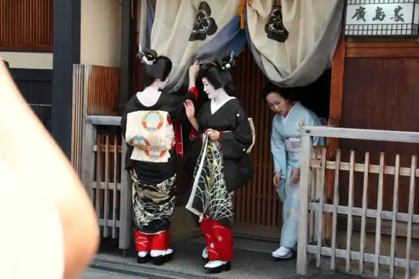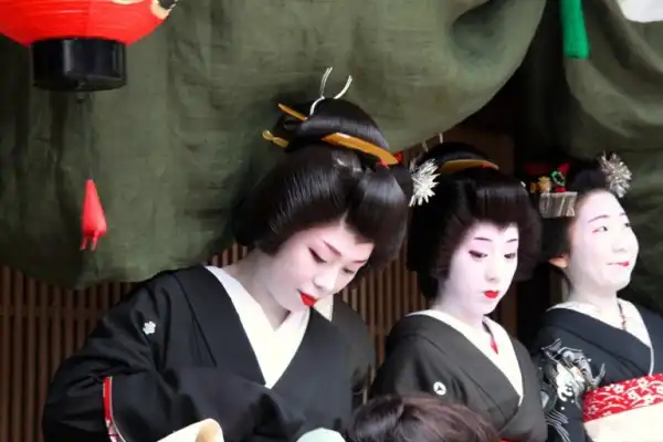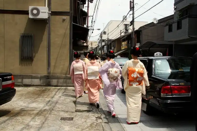 Обычно выходят все вместе: впереди — самые старшие и самые важные. Либо это сама владелица окия (дома гейш), либо старшая из гейш по рангу. Потом идут гейши помладше, затем майко (начинающие гейко, гейши-ученицы) тоже в зависимости от ранга, и замыкают шествие самые незначительные пока по положению девушки — сикоми, первая стадия обучения (по сути — прислуга).