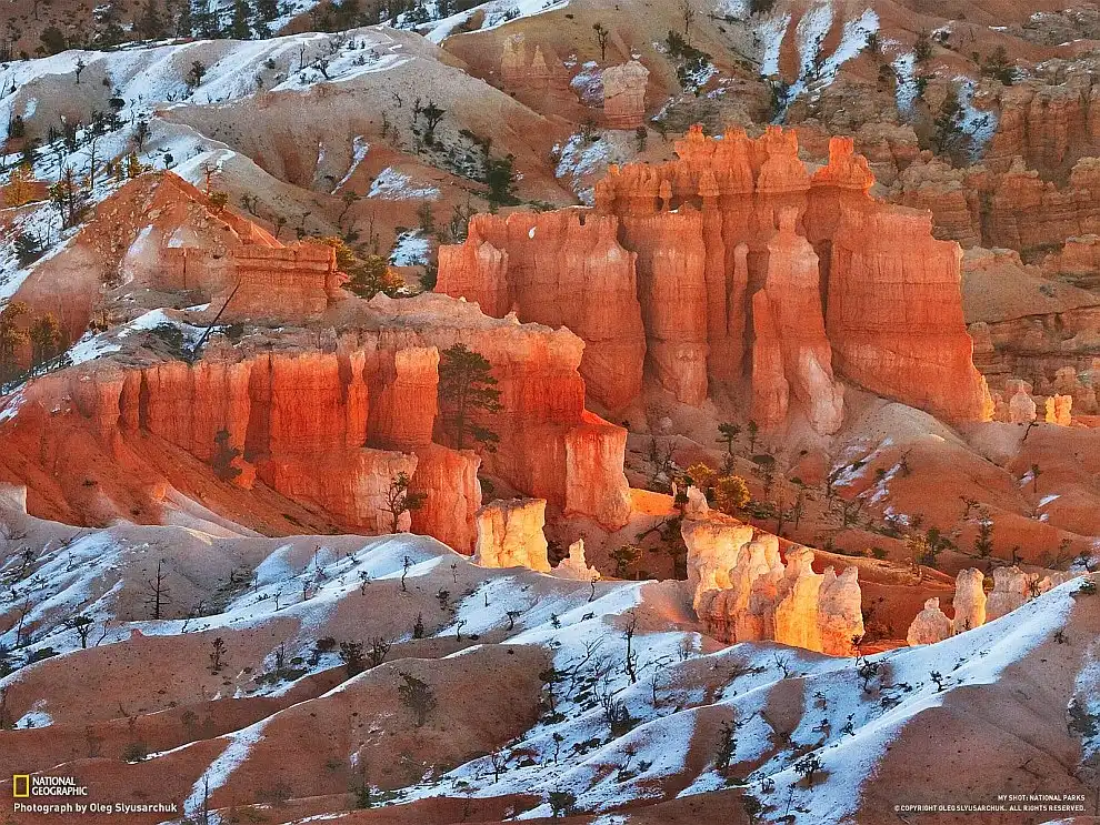 Национальный парк Брайс-Каньон, штат Юта. Основной достопримечательностью парка является каньон Брайс. Несмотря на название, это не совсем каньон, а скорее гигантский природный амфитеатр, созданный эрозией. Красные, оранжевые и белые цвета горных пород представляют захватывающее зрелище, особенно на восходе или закате солнца: