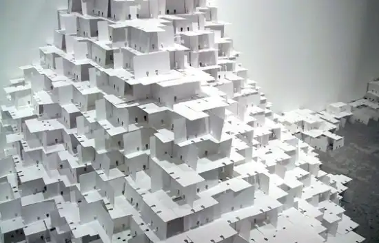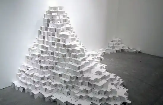 Инсталляции Джин Шин наглядно демонстрируют популярную современную идею, что искусство живет везде, даже в самых банальных, обыденных и ненужных вещах. Строительство небоскребов из старых коробочек для таблеток или целых бумажных замков - работа щепетильная и требующая громадной концентрации усилий и внимания. Создание новой формы из бесформенности (или другой, старой формы) удается Джин.