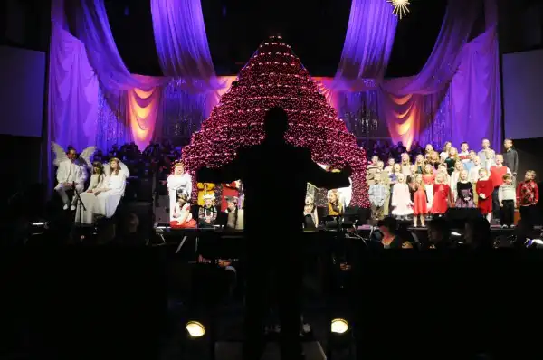 31. Дирижер с хором и оркестром на рождественском концерте в Нампе, штат Айдахо. Здание в несколько этажей с 100 000 огнями менялось во время представления. (The Idaho Press-Tribune / Charlie Litchfield)