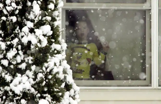Мальчик смотрит на заснеженную улицу в ЛаПорте, штат Индиана.