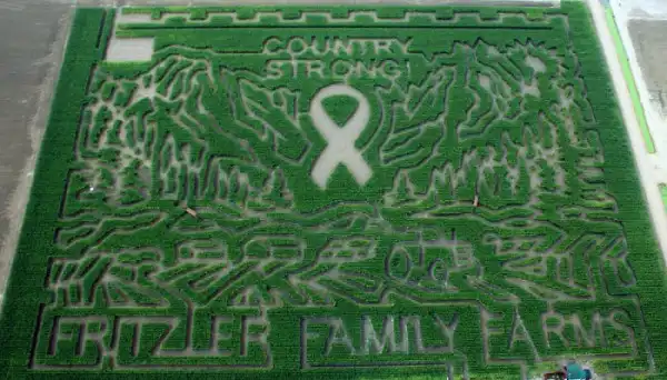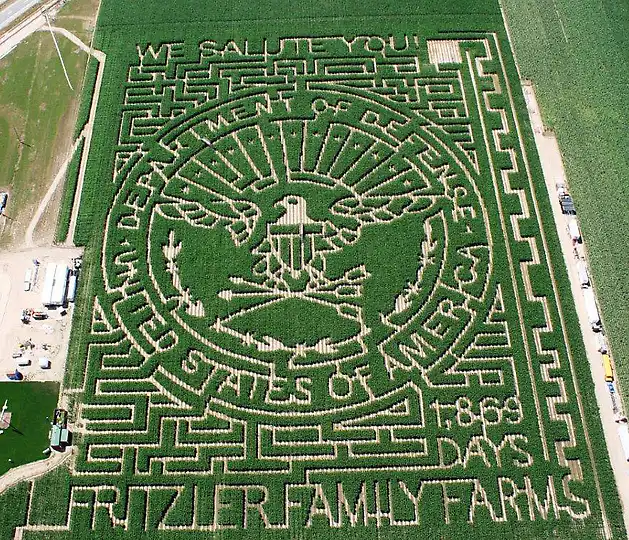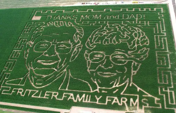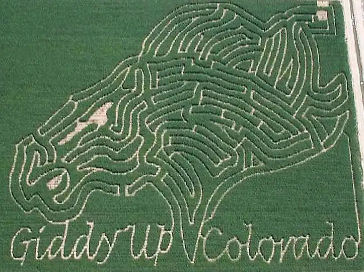 1. Первый кукурузный лабиринт, появившийся на ферме Глена и Пэм Фритцлеров в Ласалле, Колорадо. Их ферма известна как «Лабиринты Фритцлеров». Лабиринт изображает логотип «Denver Bronco».