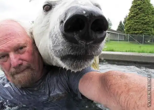 16-летнюю белую медведицу зовут Эйджи, дрессировщик носит скромное имя Марк.