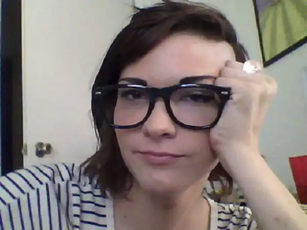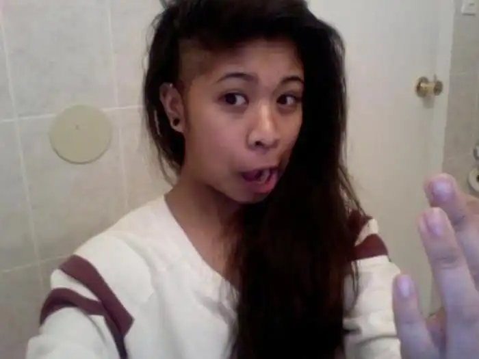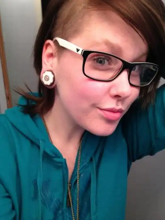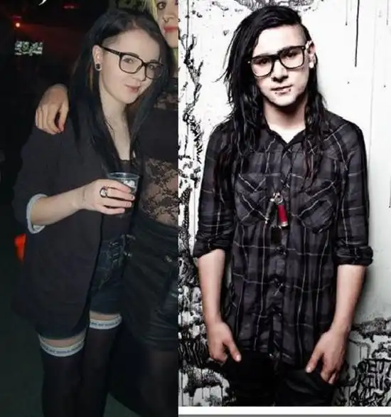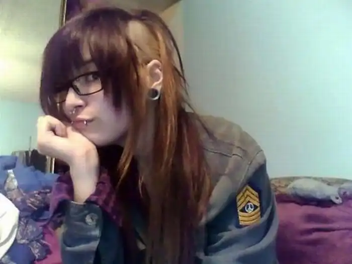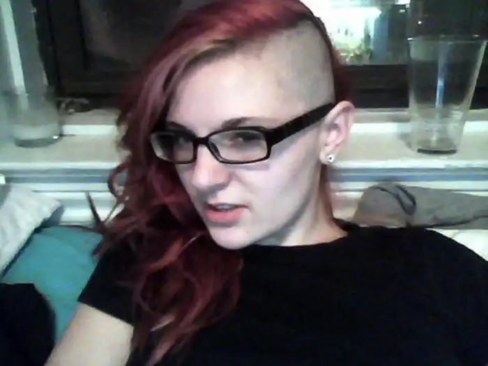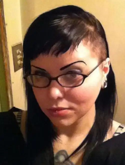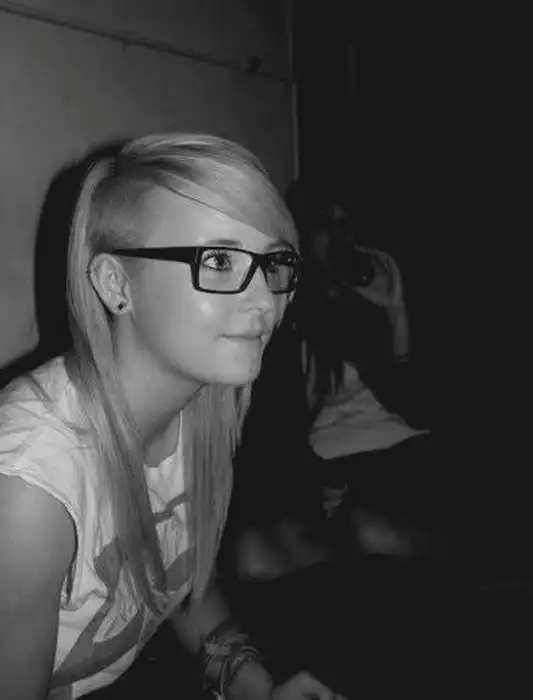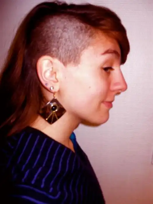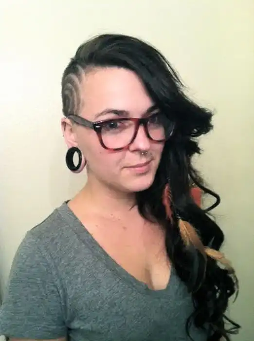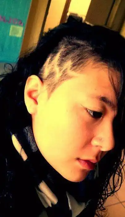 У него длинные волосы, зачесанные на бок, а со стороны пробора выбрита височная область.
