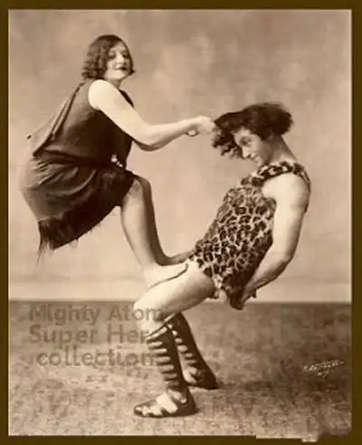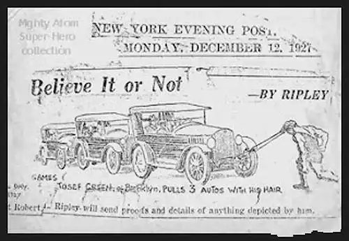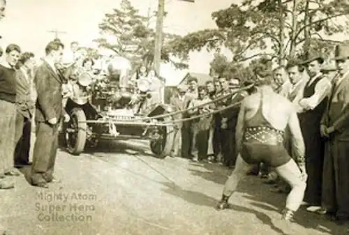 Одним из самых изумительных трюков Могучего Атома было привязывание к волосам на голове веревки, на другом конце которой был грузовик, наполненный пассажирами. Затем под восторженные вздохи и крики Джо тащил грузовик (или сцепку из трех легковых машин), словно суровый механический тягач. Это была поистине атомная тяга. Сейчас бы написали — термоядерная.