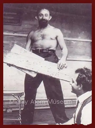 В 1914 году у жены Гринштейна Лии завелся безответный поклонник, который додумался выстрелить Джозефу в лоб с расстояния 10 метров. Ударившись о череп молодого борца, пуля… сплющилась, не причинив Джозефу никакого вреда — в больнице он провел всего пару часов, и то в роли «выставочного» феномена. Польщенный вниманием к своим необычным способностям, Гринштейн разработал комплекс силовых трюков, позволяющих не только кормить семью, а и совершенствовать познания о скрытых силах тренированного организма. В том же году «малыша Гринштейна» не стало — на афишах его сменил силач невысокого роста с недюжинным псевдонимом «The Mighty Atom» («Могучий Атом»). Ну, то есть, маленький, да удаленький.