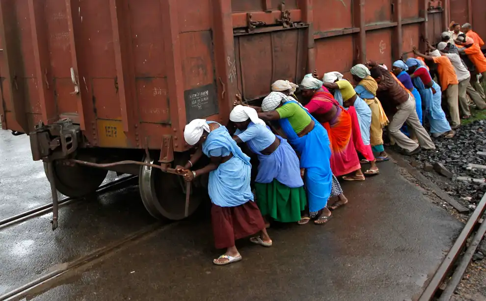 28. Железнодорожные рабочие толкают вагон с углем обратно на путь, после того как он сошел с него у электростанции в Ахмедабаде, Индия. 4 человека пострадали в результате этого инцидента. (Amit Dave/Reuters)