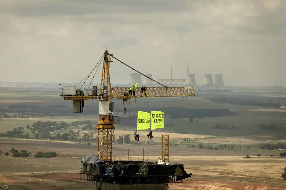 41. Экологическая акция «Гринпис»: активисты висят на кране на территории электростанции в районе Делмас в ЮАР. Надпись на баннере: «Убийца климата». (Shayne Robinson/Greenpeace Handout/AFP/Getty Images)