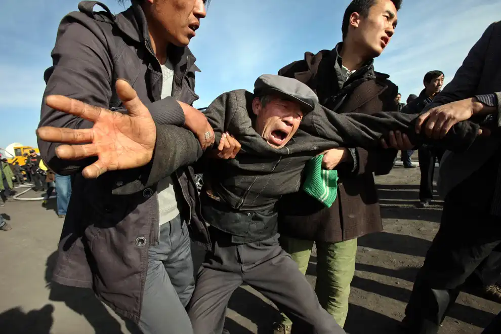 43. Отца пропавшего без вести шахтера уводят от шахты в китайской провинции Ганьсу. (AP)