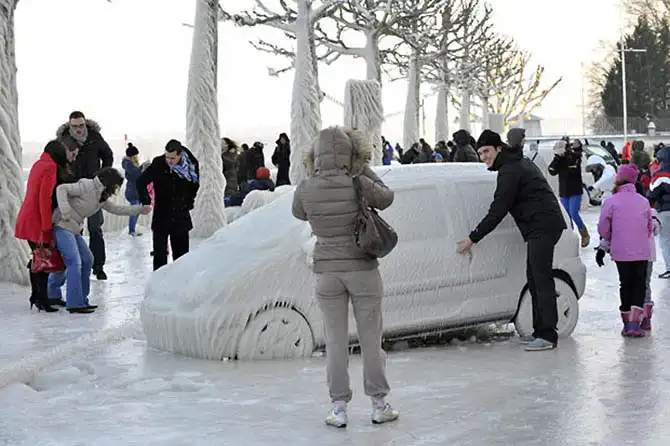 Кто-то фотографируется рядом с напрочь замерзшим автомобилем, а кто-то и вовсе застрял каблуком во льду.