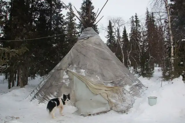 3. Подъехав к чуму нам сказали что шаман занят. На входе в чум преданно ожидает хозяина его лайка.