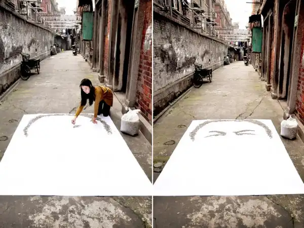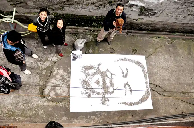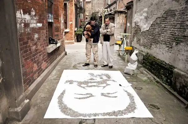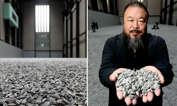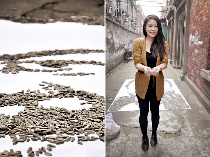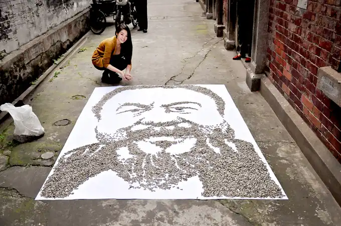 Портрет современного художника из Китая Вейвея (Weiwei), который в 2010 году в Лондоне представил инсталляцию из 100 000 000 фарфоровых семян подсолнечника, ровным слоем рассыпанных по полу. Для изготовления такого количества семян было задействовано 1600 китайских рабочих.