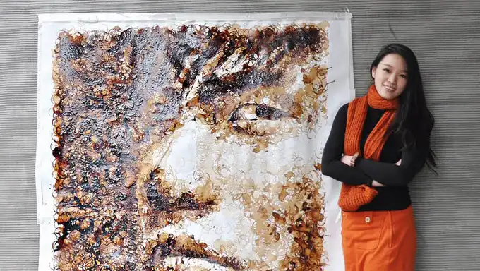 Художница Red рядом со своей картиной нарисованной с помощью чашки и кофе