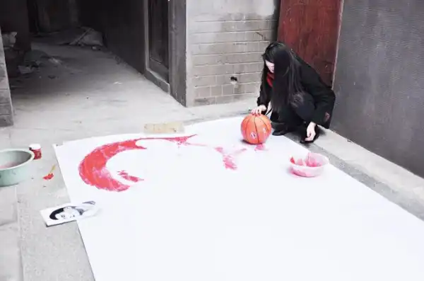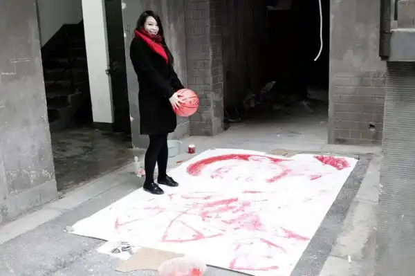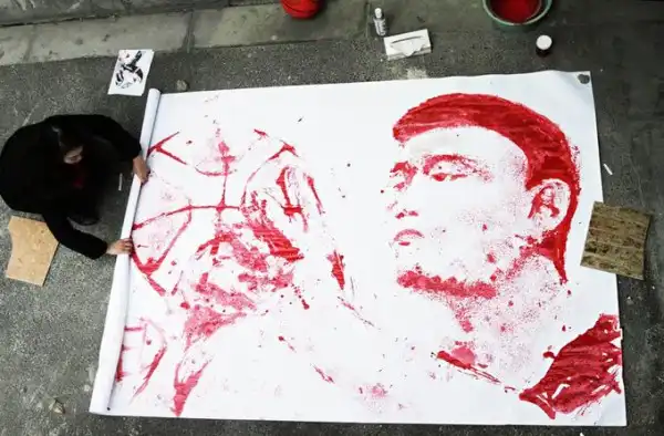 Портрет китайского баскетболиста Яо Миня, самого высокого игрока NBA (229 см), нарисован баскетбольным мячом.