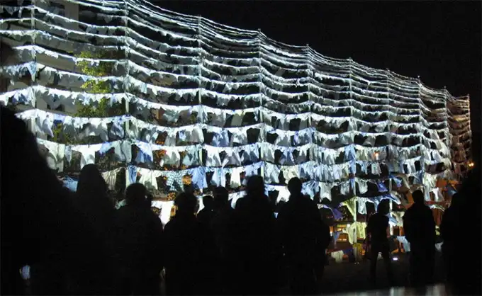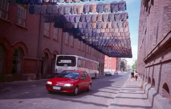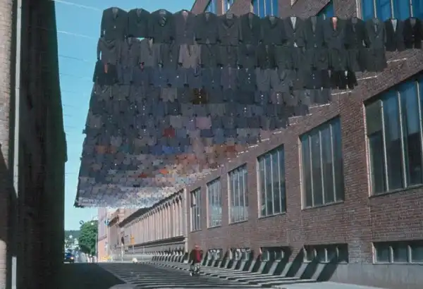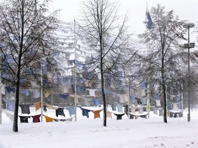 Финская художница Каарина Кэйкконен (Kaarina Kaikkonen) создает инсталляции из одежды секонд-хэнд. Художница развешивает одежду на веревке, словно после прачечной. Кто бы подумал, что веревки для белья могут создавать такой интригующий арт?
