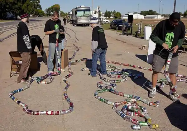 17. Самая длинная цепь из алюминиевых банок состоит из 66343 банок, Де Пер, штат Висконсин, США. Общая длина составила более пяти километров.