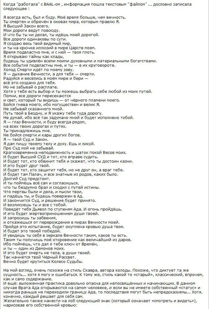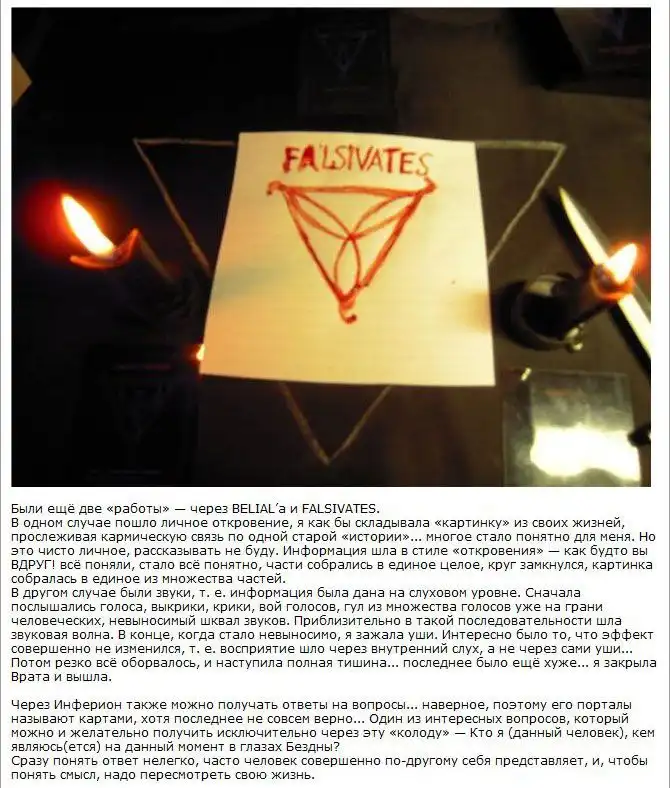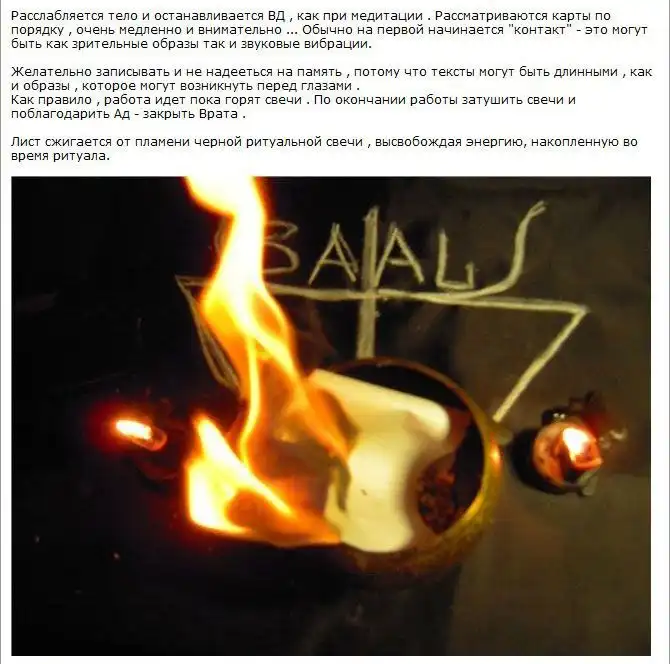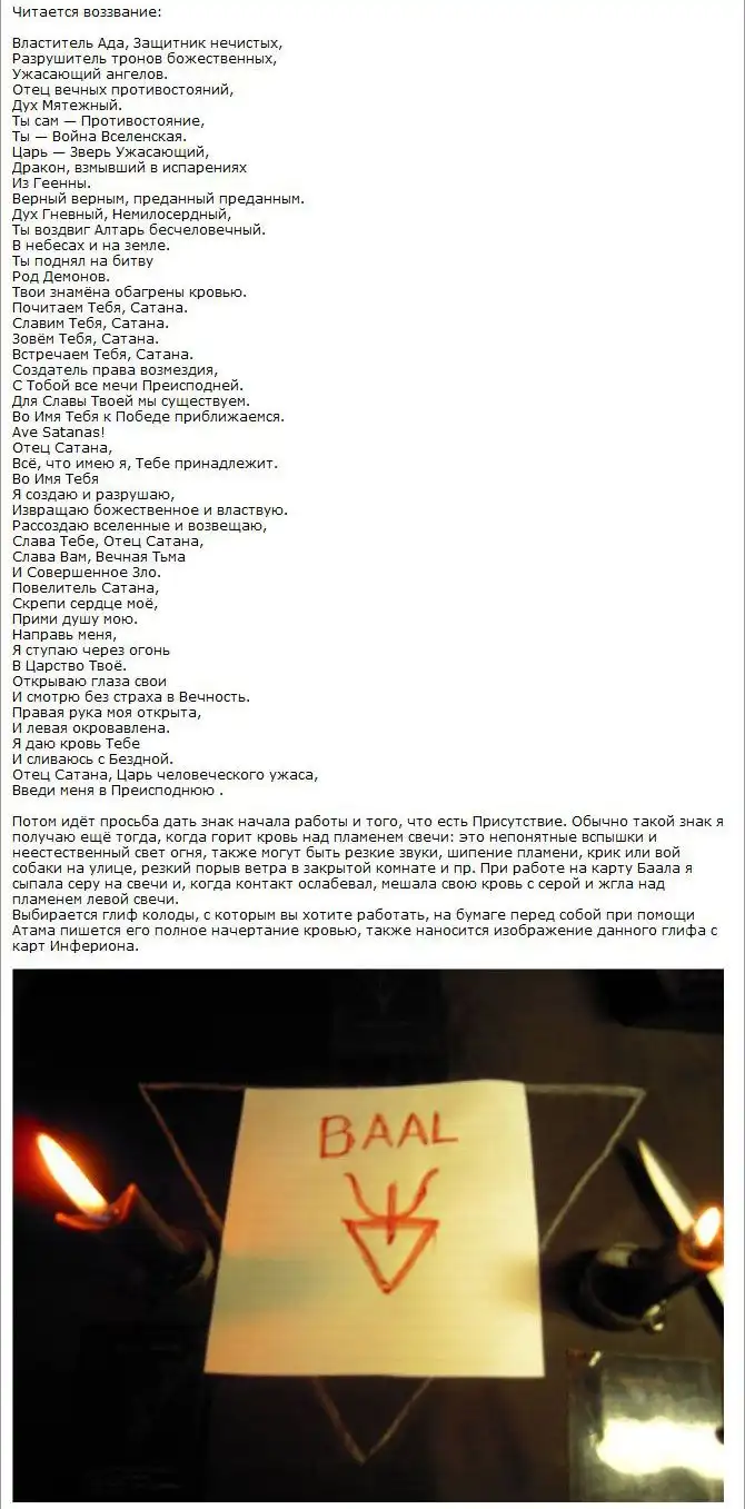 На одном очень мрачном форуме я нашел ритуал, описанный одной малолетней дурочкой. Она вызывала какого-то демона. Весь текст я оставил без изменений. Повторять его крайне не рекомендую, а то вас засмеют :) А ведь правду говорят, что когда людям нечем заняться, они начинают искать себе приключений на "одно место"...